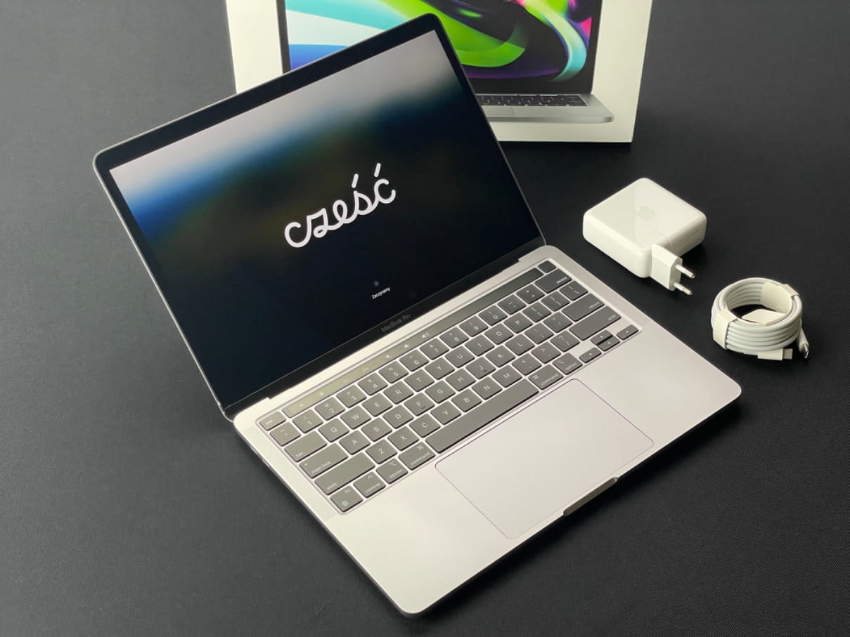 - Macbook nosi niewielkie/normalne ślady użytkowania, bardzo lekko zadrapana obudowa wyświetlacza w lewym dolnym rogu, kilka drobnych otarć na krawędziach obudowy.