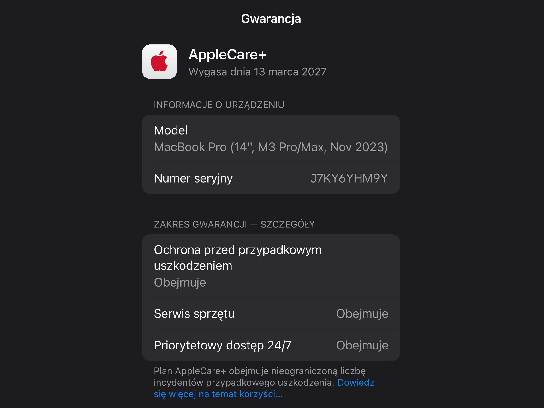 - Gwarancja producenta APPLE CARE PLUS do: 13.03.2027 /Gwarancja obejmuje uszkodzenia mechaniczne, jeśli przypadkiem MacBook spadnie Ci w 10-tego piętra, apple wymieni wszystkie uszkodzone części na nowe, za darmo/